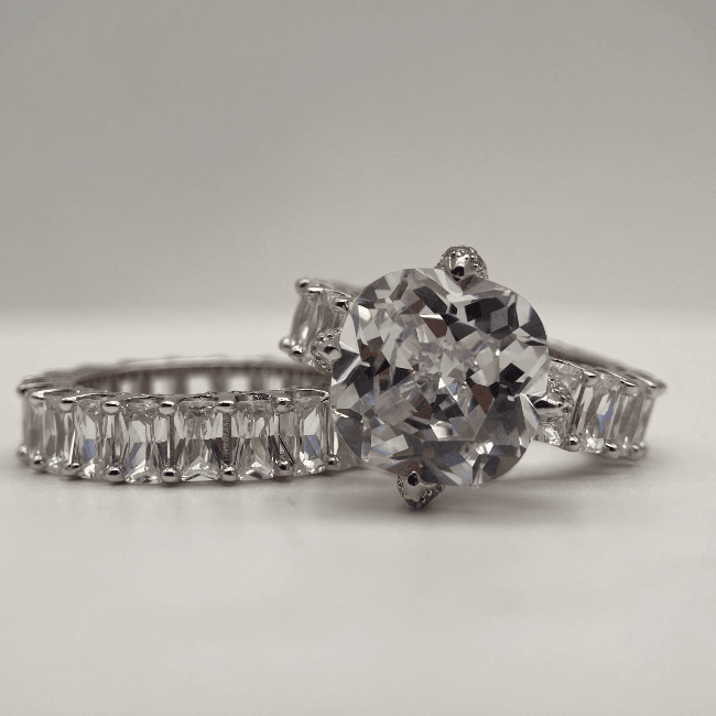 Cushion Cut Solitare Bridal Set Ring with Round Cut Eternity Ring in Sterling Silver